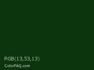 RGB 13,53,13 Color is a very dark green color and the nearest color is Palm Leaf #19330e. Hex code #0d350d and RGB value is rgb(13,53,13). In RGB color space, this color is composed of 5% red, 21% green, 5% blue, In CMYK color space, this color is composed of 75% cyan, 0% magenta, 75% yellow , 79% black , In HSL color space, this color has a hue angle of 120° , 61% saturation and 13% lightness.