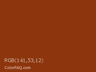 RGB 141,53,12 Color is a dark orange color and the nearest color is Kobe #882d17. Hex code #8d350c and RGB value is rgb(141,53,12). In RGB color space, this color is composed of 55% red, 21% green, 5% blue, In CMYK color space, this color is composed of 0% cyan, 62% magenta, 91% yellow , 45% black , In HSL color space, this color has a hue angle of 19° , 84% saturation and 30% lightness.