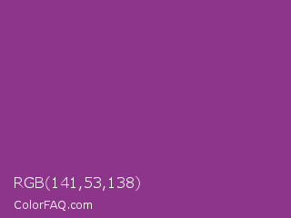 RGB 141,53,138 Color is a normal magenta color and the nearest color is Vivid Violet #803790. Hex code #8d358a and RGB value is rgb(141,53,138). In RGB color space, this color is composed of 55% red, 21% green, 54% blue, In CMYK color space, this color is composed of 0% cyan, 62% magenta, 2% yellow , 45% black , In HSL color space, this color has a hue angle of 302° , 45% saturation and 38% lightness.