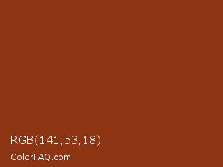 RGB 141,53,18 Color is a normal orange color and the nearest color is Kobe #882d17. Hex code #8d3512 and RGB value is rgb(141,53,18). In RGB color space, this color is composed of 55% red, 21% green, 7% blue, In CMYK color space, this color is composed of 0% cyan, 62% magenta, 87% yellow , 45% black , In HSL color space, this color has a hue angle of 17° , 77% saturation and 31% lightness.