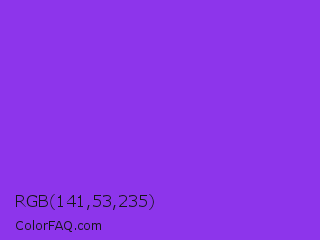RGB 141,53,235 Color is a normal violet color and the nearest color is Blue Violet #8a2be2. Hex code #8d35eb and RGB value is rgb(141,53,235). In RGB color space, this color is composed of 55% red, 21% green, 92% blue, In CMYK color space, this color is composed of 40% cyan, 77% magenta, 0% yellow , 8% black , In HSL color space, this color has a hue angle of 269° , 82% saturation and 56% lightness.