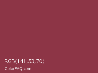 RGB 141,53,70 Color is a normal red color and the nearest color is Solid Pink #893843. Hex code #8d3546 and RGB value is rgb(141,53,70). In RGB color space, this color is composed of 55% red, 21% green, 27% blue, In CMYK color space, this color is composed of 0% cyan, 62% magenta, 50% yellow , 45% black , In HSL color space, this color has a hue angle of 348° , 45% saturation and 38% lightness.
