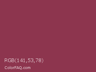 RGB 141,53,78 Color is a normal rose color and the nearest color is Camelot #893456. Hex code #8d354e and RGB value is rgb(141,53,78). In RGB color space, this color is composed of 55% red, 21% green, 31% blue, In CMYK color space, this color is composed of 0% cyan, 62% magenta, 45% yellow , 45% black , In HSL color space, this color has a hue angle of 343° , 45% saturation and 38% lightness.