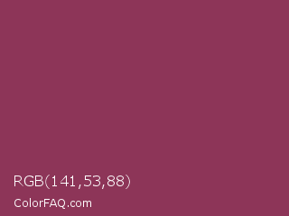 RGB 141,53,88 Color is a normal rose color and the nearest color is Camelot #893456. Hex code #8d3558 and RGB value is rgb(141,53,88). In RGB color space, this color is composed of 55% red, 21% green, 35% blue, In CMYK color space, this color is composed of 0% cyan, 62% magenta, 38% yellow , 45% black , In HSL color space, this color has a hue angle of 336° , 45% saturation and 38% lightness.