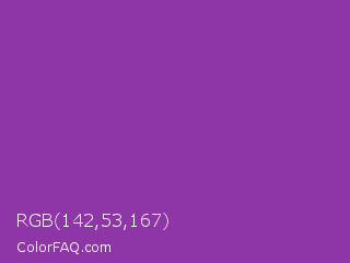 RGB 142,53,167 Color is a normal purple color and the nearest color is Vivid Violet #803790. Hex code #8e35a7 and RGB value is rgb(142,53,167). In RGB color space, this color is composed of 56% red, 21% green, 65% blue, In CMYK color space, this color is composed of 15% cyan, 68% magenta, 0% yellow , 35% black , In HSL color space, this color has a hue angle of 287° , 52% saturation and 43% lightness.