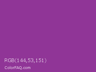 RGB 144,53,151 Color is a normal magenta color and the nearest color is Vivid Violet #803790. Hex code #903597 and RGB value is rgb(144,53,151). In RGB color space, this color is composed of 56% red, 21% green, 59% blue, In CMYK color space, this color is composed of 5% cyan, 65% magenta, 0% yellow , 41% black , In HSL color space, this color has a hue angle of 296° , 48% saturation and 40% lightness.