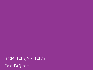 RGB 145,53,147 Color is a normal magenta color and the nearest color is Vivid Violet #803790. Hex code #913593 and RGB value is rgb(145,53,147). In RGB color space, this color is composed of 57% red, 21% green, 58% blue, In CMYK color space, this color is composed of 1% cyan, 64% magenta, 0% yellow , 42% black , In HSL color space, this color has a hue angle of 299° , 47% saturation and 39% lightness.