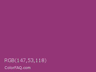 RGB 147,53,118 Color is a normal magenta color and the nearest color is Razzmic Berry Crayola #843179. Hex code #933576 and RGB value is rgb(147,53,118). In RGB color space, this color is composed of 58% red, 21% green, 46% blue, In CMYK color space, this color is composed of 0% cyan, 64% magenta, 20% yellow , 42% black , In HSL color space, this color has a hue angle of 319° , 47% saturation and 39% lightness.