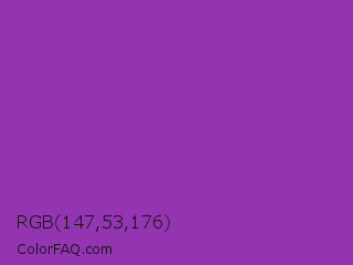 RGB 147,53,176 Color is a normal purple color and the nearest color is Purpureus #9a4eae. Hex code #9335b0 and RGB value is rgb(147,53,176). In RGB color space, this color is composed of 58% red, 21% green, 69% blue, In CMYK color space, this color is composed of 16% cyan, 70% magenta, 0% yellow , 31% black , In HSL color space, this color has a hue angle of 286° , 54% saturation and 45% lightness.