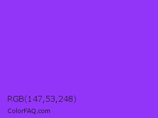 RGB 147,53,248 Color is a normal violet color and the nearest color is Blue Violet #8a2be2. Hex code #9335f8 and RGB value is rgb(147,53,248). In RGB color space, this color is composed of 58% red, 21% green, 97% blue, In CMYK color space, this color is composed of 41% cyan, 79% magenta, 0% yellow , 3% black , In HSL color space, this color has a hue angle of 269° , 93% saturation and 59% lightness.