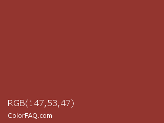 RGB 147,53,47 Color is a normal red color and the nearest color is El Salva #8f3e33. Hex code #93352f and RGB value is rgb(147,53,47). In RGB color space, this color is composed of 58% red, 21% green, 18% blue, In CMYK color space, this color is composed of 0% cyan, 64% magenta, 68% yellow , 42% black , In HSL color space, this color has a hue angle of 4° , 52% saturation and 38% lightness.