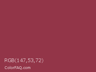 RGB 147,53,72 Color is a normal red color and the nearest color is Smoky Topaz #933d41. Hex code #933548 and RGB value is rgb(147,53,72). In RGB color space, this color is composed of 58% red, 21% green, 28% blue, In CMYK color space, this color is composed of 0% cyan, 64% magenta, 51% yellow , 42% black , In HSL color space, this color has a hue angle of 348° , 47% saturation and 39% lightness.