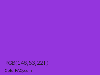RGB 148,53,221 Color is a normal purple color and the nearest color is Blue Violet #8a2be2. Hex code #9435dd and RGB value is rgb(148,53,221). In RGB color space, this color is composed of 58% red, 21% green, 87% blue, In CMYK color space, this color is composed of 33% cyan, 76% magenta, 0% yellow , 13% black , In HSL color space, this color has a hue angle of 274° , 71% saturation and 54% lightness.