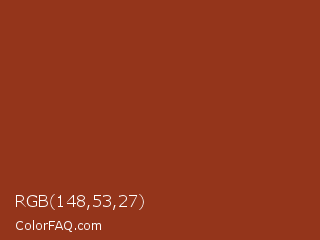 RGB 148,53,27 Color is a normal red color and the nearest color is Prairie Sand #9a3820. Hex code #94351b and RGB value is rgb(148,53,27). In RGB color space, this color is composed of 58% red, 21% green, 11% blue, In CMYK color space, this color is composed of 0% cyan, 64% magenta, 82% yellow , 42% black , In HSL color space, this color has a hue angle of 13° , 69% saturation and 34% lightness.