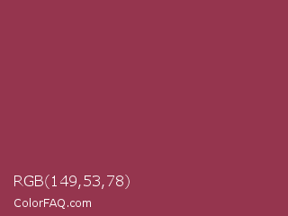 RGB 149,53,78 Color is a normal rose color and the nearest color is Quinacridone Magenta #8e3a59. Hex code #95354e and RGB value is rgb(149,53,78). In RGB color space, this color is composed of 58% red, 21% green, 31% blue, In CMYK color space, this color is composed of 0% cyan, 64% magenta, 48% yellow , 42% black , In HSL color space, this color has a hue angle of 344° , 48% saturation and 40% lightness.