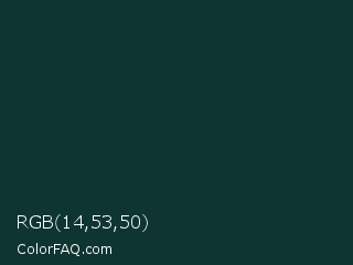 RGB 14,53,50 Color is a very dark cyan color and the nearest color is Gable Green #163531. Hex code #0e3532 and RGB value is rgb(14,53,50). In RGB color space, this color is composed of 5% red, 21% green, 20% blue, In CMYK color space, this color is composed of 74% cyan, 0% magenta, 6% yellow , 79% black , In HSL color space, this color has a hue angle of 175° , 58% saturation and 13% lightness.