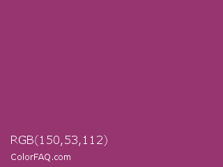 RGB 150,53,112 Color is a normal magenta color and the nearest color is Rouge #a23b6c. Hex code #963570 and RGB value is rgb(150,53,112). In RGB color space, this color is composed of 59% red, 21% green, 44% blue, In CMYK color space, this color is composed of 0% cyan, 65% magenta, 25% yellow , 41% black , In HSL color space, this color has a hue angle of 324° , 48% saturation and 40% lightness.