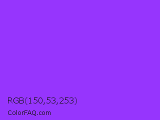 RGB 150,53,253 Color is a normal violet color and the nearest color is Veronica #a020f0. Hex code #9635fd and RGB value is rgb(150,53,253). In RGB color space, this color is composed of 59% red, 21% green, 99% blue, In CMYK color space, this color is composed of 41% cyan, 79% magenta, 0% yellow , 1% black , In HSL color space, this color has a hue angle of 269° , 98% saturation and 60% lightness.