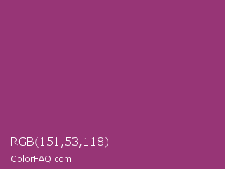 RGB 151,53,118 Color is a normal magenta color and the nearest color is Rouge #a23b6c. Hex code #973576 and RGB value is rgb(151,53,118). In RGB color space, this color is composed of 59% red, 21% green, 46% blue, In CMYK color space, this color is composed of 0% cyan, 65% magenta, 22% yellow , 41% black , In HSL color space, this color has a hue angle of 320° , 48% saturation and 40% lightness.