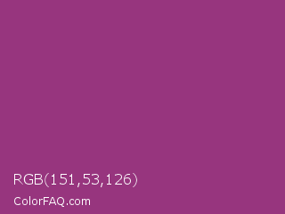 RGB 151,53,126 Color is a normal magenta color and the nearest color is Maximum Red Purple #a63a79. Hex code #97357e and RGB value is rgb(151,53,126). In RGB color space, this color is composed of 59% red, 21% green, 49% blue, In CMYK color space, this color is composed of 0% cyan, 65% magenta, 17% yellow , 41% black , In HSL color space, this color has a hue angle of 315° , 48% saturation and 40% lightness.