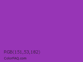 RGB 151,53,182 Color is a normal purple color and the nearest color is Dark Orchid #9932cc. Hex code #9735b6 and RGB value is rgb(151,53,182). In RGB color space, this color is composed of 59% red, 21% green, 71% blue, In CMYK color space, this color is composed of 17% cyan, 71% magenta, 0% yellow , 29% black , In HSL color space, this color has a hue angle of 286° , 55% saturation and 46% lightness.