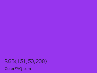 RGB 151,53,238 Color is a normal purple color and the nearest color is Blue Violet #8a2be2. Hex code #9735ee and RGB value is rgb(151,53,238). In RGB color space, this color is composed of 59% red, 21% green, 93% blue, In CMYK color space, this color is composed of 37% cyan, 78% magenta, 0% yellow , 7% black , In HSL color space, this color has a hue angle of 272° , 84% saturation and 57% lightness.