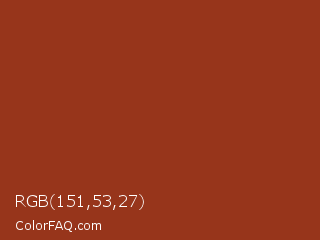 RGB 151,53,27 Color is a normal red color and the nearest color is Prairie Sand #9a3820. Hex code #97351b and RGB value is rgb(151,53,27). In RGB color space, this color is composed of 59% red, 21% green, 11% blue, In CMYK color space, this color is composed of 0% cyan, 65% magenta, 82% yellow , 41% black , In HSL color space, this color has a hue angle of 13° , 70% saturation and 35% lightness.