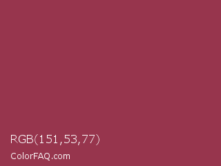 RGB 151,53,77 Color is a normal red color and the nearest color is Smoky Topaz #933d41. Hex code #97354d and RGB value is rgb(151,53,77). In RGB color space, this color is composed of 59% red, 21% green, 30% blue, In CMYK color space, this color is composed of 0% cyan, 65% magenta, 49% yellow , 41% black , In HSL color space, this color has a hue angle of 345° , 48% saturation and 40% lightness.