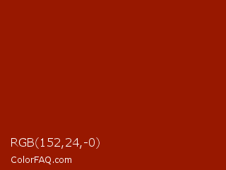 RGB 152,24,-0 Color is a dark red color and the nearest color is Totem Pole #991b07. Hex code #981800 and RGB value is rgb(152,24,-0). In RGB color space, this color is composed of 60% red, 9% green, 0% blue, In CMYK color space, this color is composed of 0% cyan, 84% magenta, 100% yellow , 40% black , In HSL color space, this color has a hue angle of 9° , 100% saturation and 30% lightness.