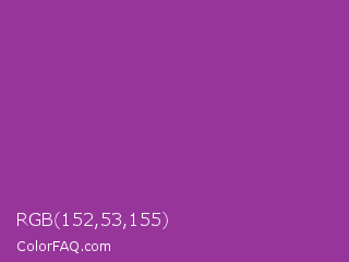 RGB 152,53,155 Color is a normal magenta color and the nearest color is Vivid Violet #803790. Hex code #98359b and RGB value is rgb(152,53,155). In RGB color space, this color is composed of 60% red, 21% green, 61% blue, In CMYK color space, this color is composed of 2% cyan, 66% magenta, 0% yellow , 39% black , In HSL color space, this color has a hue angle of 298° , 49% saturation and 41% lightness.