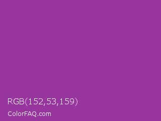 RGB 152,53,159 Color is a normal magenta color and the nearest color is Vivid Violet #803790. Hex code #98359f and RGB value is rgb(152,53,159). In RGB color space, this color is composed of 60% red, 21% green, 62% blue, In CMYK color space, this color is composed of 4% cyan, 67% magenta, 0% yellow , 38% black , In HSL color space, this color has a hue angle of 296° , 50% saturation and 42% lightness.