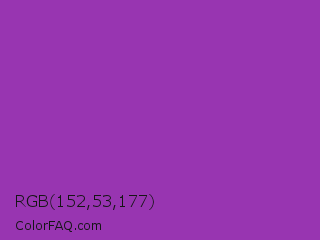 RGB 152,53,177 Color is a normal purple color and the nearest color is Purpureus #9a4eae. Hex code #9835b1 and RGB value is rgb(152,53,177). In RGB color space, this color is composed of 60% red, 21% green, 69% blue, In CMYK color space, this color is composed of 14% cyan, 70% magenta, 0% yellow , 31% black , In HSL color space, this color has a hue angle of 288° , 54% saturation and 45% lightness.