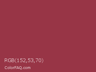 RGB 152,53,70 Color is a normal red color and the nearest color is Smoky Topaz #933d41. Hex code #983546 and RGB value is rgb(152,53,70). In RGB color space, this color is composed of 60% red, 21% green, 27% blue, In CMYK color space, this color is composed of 0% cyan, 65% magenta, 54% yellow , 40% black , In HSL color space, this color has a hue angle of 350° , 48% saturation and 40% lightness.