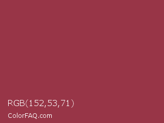RGB 152,53,71 Color is a normal red color and the nearest color is Smoky Topaz #933d41. Hex code #983547 and RGB value is rgb(152,53,71). In RGB color space, this color is composed of 60% red, 21% green, 28% blue, In CMYK color space, this color is composed of 0% cyan, 65% magenta, 53% yellow , 40% black , In HSL color space, this color has a hue angle of 349° , 48% saturation and 40% lightness.