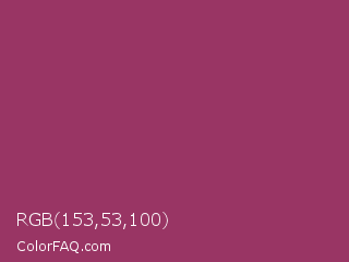 RGB 153,53,100 Color is a normal rose color and the nearest color is Vin Rouge #983d61. Hex code #993564 and RGB value is rgb(153,53,100). In RGB color space, this color is composed of 60% red, 21% green, 39% blue, In CMYK color space, this color is composed of 0% cyan, 65% magenta, 35% yellow , 40% black , In HSL color space, this color has a hue angle of 332° , 49% saturation and 40% lightness.
