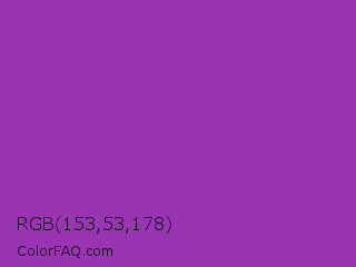 RGB 153,53,178 Color is a normal purple color and the nearest color is Purpureus #9a4eae. Hex code #9935b2 and RGB value is rgb(153,53,178). In RGB color space, this color is composed of 60% red, 21% green, 70% blue, In CMYK color space, this color is composed of 14% cyan, 70% magenta, 0% yellow , 30% black , In HSL color space, this color has a hue angle of 288° , 54% saturation and 45% lightness.