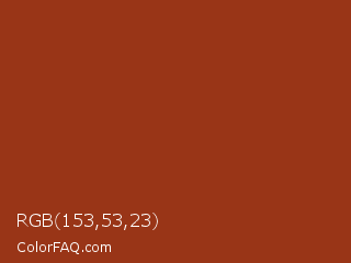 RGB 153,53,23 Color is a normal red color and the nearest color is Cognac #9f381d. Hex code #993517 and RGB value is rgb(153,53,23). In RGB color space, this color is composed of 60% red, 21% green, 9% blue, In CMYK color space, this color is composed of 0% cyan, 65% magenta, 85% yellow , 40% black , In HSL color space, this color has a hue angle of 14° , 74% saturation and 35% lightness.