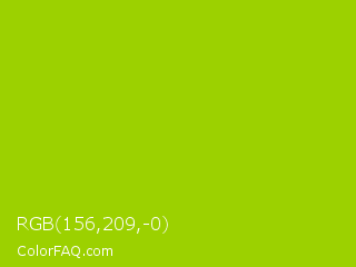 RGB 156,209,-0 Color is a normal lime color and the nearest color is Sheen Green #8fd400. Hex code #9cd100 and RGB value is rgb(156,209,-0). In RGB color space, this color is composed of 61% red, 82% green, 0% blue, In CMYK color space, this color is composed of 25% cyan, 0% magenta, 100% yellow , 18% black , In HSL color space, this color has a hue angle of 75° , 100% saturation and 41% lightness.