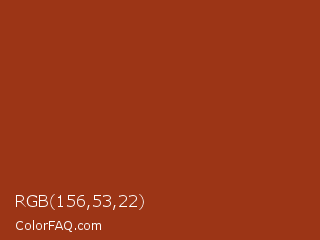 RGB 156,53,22 Color is a normal red color and the nearest color is Cognac #9f381d. Hex code #9c3516 and RGB value is rgb(156,53,22). In RGB color space, this color is composed of 61% red, 21% green, 9% blue, In CMYK color space, this color is composed of 0% cyan, 66% magenta, 86% yellow , 39% black , In HSL color space, this color has a hue angle of 14° , 75% saturation and 35% lightness.