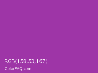 RGB 158,53,167 Color is a normal magenta color and the nearest color is Purpureus #9a4eae. Hex code #9e35a7 and RGB value is rgb(158,53,167). In RGB color space, this color is composed of 62% red, 21% green, 65% blue, In CMYK color space, this color is composed of 5% cyan, 68% magenta, 0% yellow , 35% black , In HSL color space, this color has a hue angle of 295° , 52% saturation and 43% lightness.