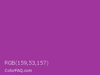 RGB 159,53,157 Color is a normal magenta color and the nearest color is Fandango #b53389. Hex code #9f359d and RGB value is rgb(159,53,157). In RGB color space, this color is composed of 62% red, 21% green, 62% blue, In CMYK color space, this color is composed of 0% cyan, 67% magenta, 1% yellow , 38% black , In HSL color space, this color has a hue angle of 301° , 50% saturation and 42% lightness.