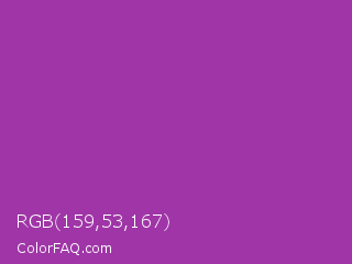 RGB 159,53,167 Color is a normal magenta color and the nearest color is Purpureus #9a4eae. Hex code #9f35a7 and RGB value is rgb(159,53,167). In RGB color space, this color is composed of 62% red, 21% green, 65% blue, In CMYK color space, this color is composed of 5% cyan, 68% magenta, 0% yellow , 35% black , In HSL color space, this color has a hue angle of 296° , 52% saturation and 43% lightness.