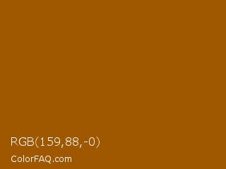 RGB 159,88,-0 Color is a normal orange color and the nearest color is Chelsea Gem #9e5302. Hex code #9f5800 and RGB value is rgb(159,88,-0). In RGB color space, this color is composed of 62% red, 35% green, 0% blue, In CMYK color space, this color is composed of 0% cyan, 45% magenta, 100% yellow , 38% black , In HSL color space, this color has a hue angle of 33° , 100% saturation and 31% lightness.