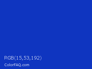 RGB 15,53,192 Color is a normal blue color and the nearest color is Persian Blue #1c39bb. Hex code #0f35c0 and RGB value is rgb(15,53,192). In RGB color space, this color is composed of 6% red, 21% green, 75% blue, In CMYK color space, this color is composed of 92% cyan, 72% magenta, 0% yellow , 25% black , In HSL color space, this color has a hue angle of 227° , 86% saturation and 41% lightness.