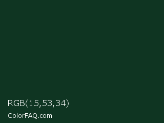 RGB 15,53,34 Color is a very dark green color and the nearest color is Phthalo Green #123524. Hex code #0f3522 and RGB value is rgb(15,53,34). In RGB color space, this color is composed of 6% red, 21% green, 13% blue, In CMYK color space, this color is composed of 72% cyan, 0% magenta, 36% yellow , 79% black , In HSL color space, this color has a hue angle of 150° , 56% saturation and 13% lightness.