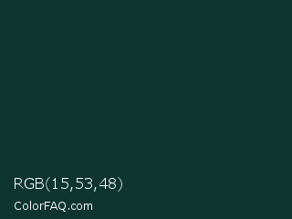 RGB 15,53,48 Color is a very dark cyan color and the nearest color is Gable Green #163531. Hex code #0f3530 and RGB value is rgb(15,53,48). In RGB color space, this color is composed of 6% red, 21% green, 19% blue, In CMYK color space, this color is composed of 72% cyan, 0% magenta, 9% yellow , 79% black , In HSL color space, this color has a hue angle of 172° , 56% saturation and 13% lightness.