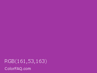 RGB 161,53,163 Color is a normal magenta color and the nearest color is Byzantine #bd33a4. Hex code #a135a3 and RGB value is rgb(161,53,163). In RGB color space, this color is composed of 63% red, 21% green, 64% blue, In CMYK color space, this color is composed of 1% cyan, 67% magenta, 0% yellow , 36% black , In HSL color space, this color has a hue angle of 299° , 51% saturation and 42% lightness.