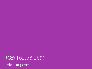 RGB 161,53,169 Color is a normal magenta color and the nearest color is Purpureus #9a4eae. Hex code #a135a9 and RGB value is rgb(161,53,169). In RGB color space, this color is composed of 63% red, 21% green, 66% blue, In CMYK color space, this color is composed of 5% cyan, 69% magenta, 0% yellow , 34% black , In HSL color space, this color has a hue angle of 296° , 52% saturation and 44% lightness.