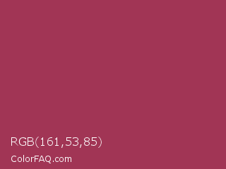 RGB 161,53,85 Color is a normal rose color and the nearest color is Night Shadz #aa375a. Hex code #a13555 and RGB value is rgb(161,53,85). In RGB color space, this color is composed of 63% red, 21% green, 33% blue, In CMYK color space, this color is composed of 0% cyan, 67% magenta, 47% yellow , 37% black , In HSL color space, this color has a hue angle of 342° , 50% saturation and 42% lightness.