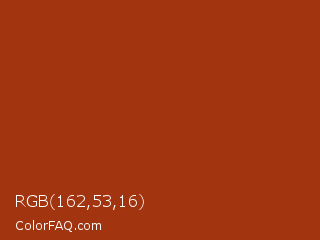 RGB 162,53,16 Color is a normal color and the nearest color is Cognac #9f381d. Hex code #a23510 and RGB value is rgb(162,53,16). In RGB color space, this color is composed of 64% red, 21% green, 6% blue, In CMYK color space, this color is composed of 0% cyan, 67% magenta, 90% yellow , 36% black , In HSL color space, this color has a hue angle of 15° , 82% saturation and 35% lightness.